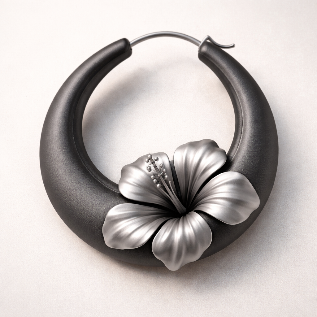 A high-resolution macro 3D CAD render of a dual-color 3D printable earring, optimized for FDM printing. The design is a smooth, continuous, matte charcoal grey (PLA) hoop shape. Positioned prominently at the bottom, layered distinctly on top of the main surface, is a detailed, metallic silver Hibiscus flower with smooth, flowing petals and a visible stamen. The design is entirely organic, without sharp angles or text. It features subtle, fine layer lines. Professional jewelry photography on a light neutral background with soft, volumetric lighting., bohemian style