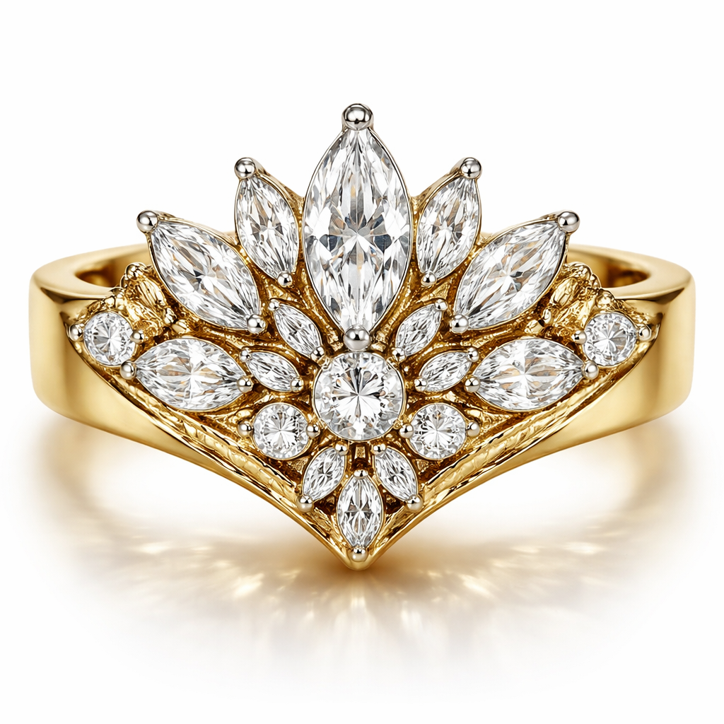 Create ring with .6 karat marquise centered, with .25 round stone directly under it with 6 more smaller marquise diamonds (2 slightly larger than the others) and 2 .15 round diamonds mounted on a wide 14k yellow gold band. Make the design in a fan shape and use platinum prongs add 6 small baguette diamonds scattered throughout