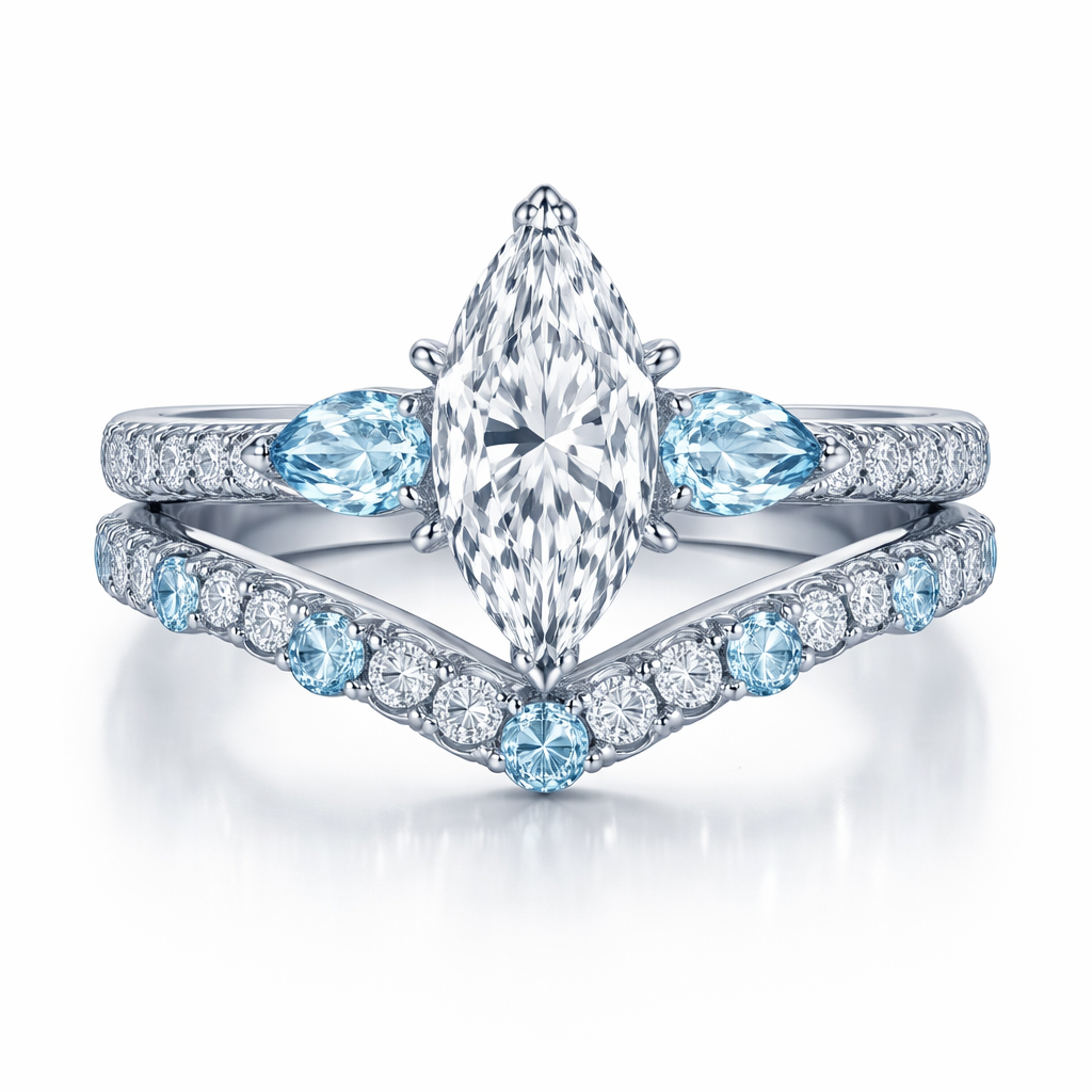 Wedding set. Marquee solitaire with aquamarine accents