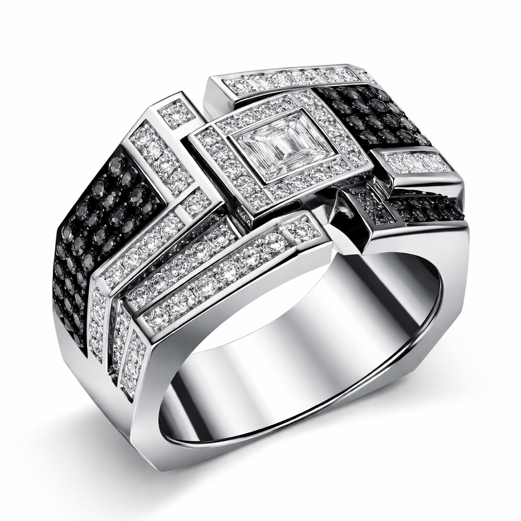 Geomatric edgy angles ring  for men of rectangular and sqaure shape of white and blcak diamonds  of unique design and special shape