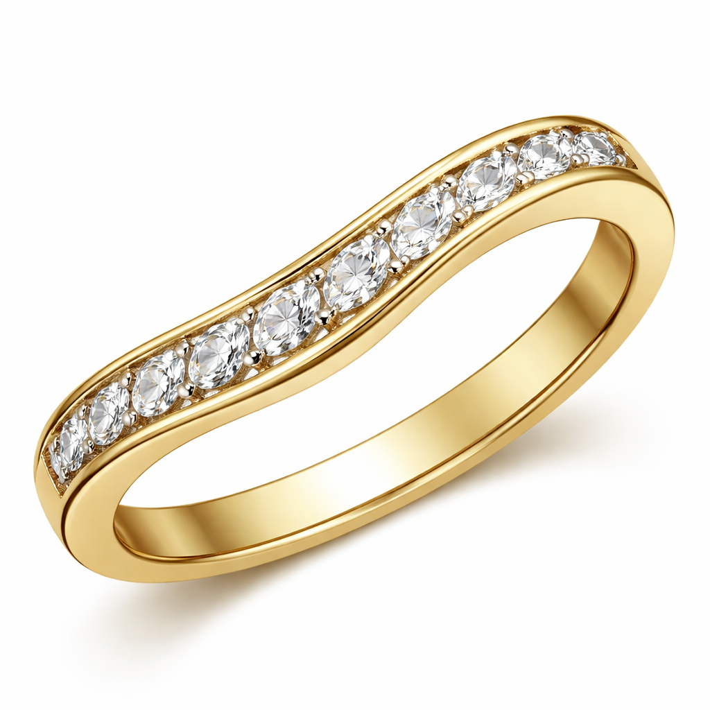 Create a single line of marquee diamonds channel set in a 14 karat yellow ring to the half shank point in a steep curve wave design. The ring should only have one row in a steep curve wave design of marquee diamonds only. 14 karat yellow gold.