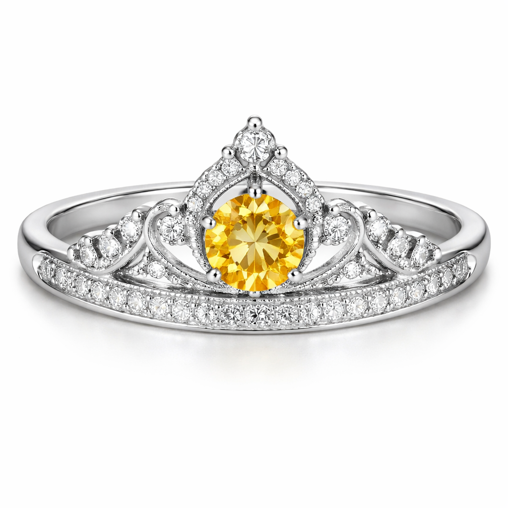 A classic women's ring made of silver with diamond stones suitable for daily wear. estilo coroa com pedra central citrino, classic style
