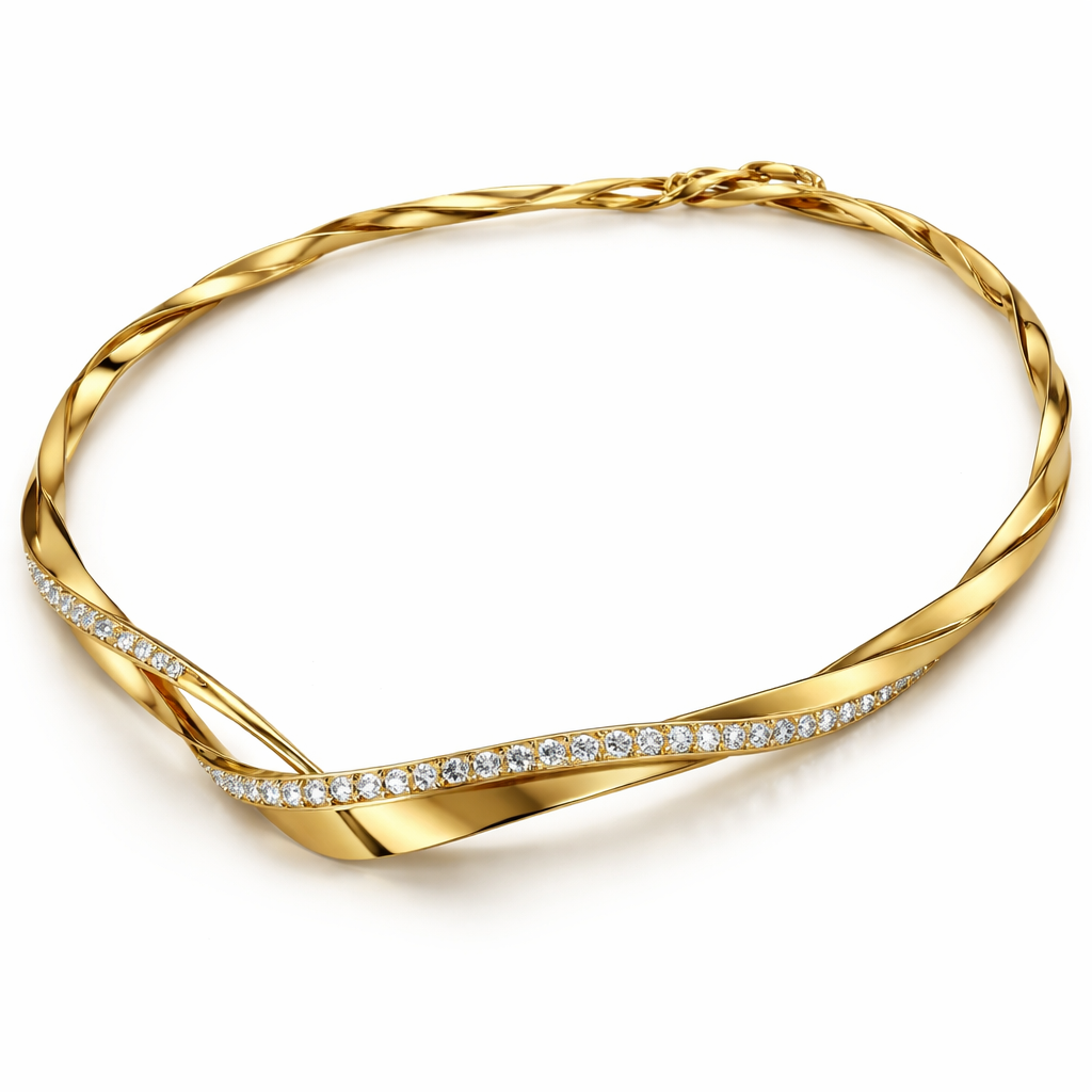 A necklace made of one flat wire that ithat has small twisted around itself that has small links n articulations that makes it flexible and is made of gold n diamond, modern style