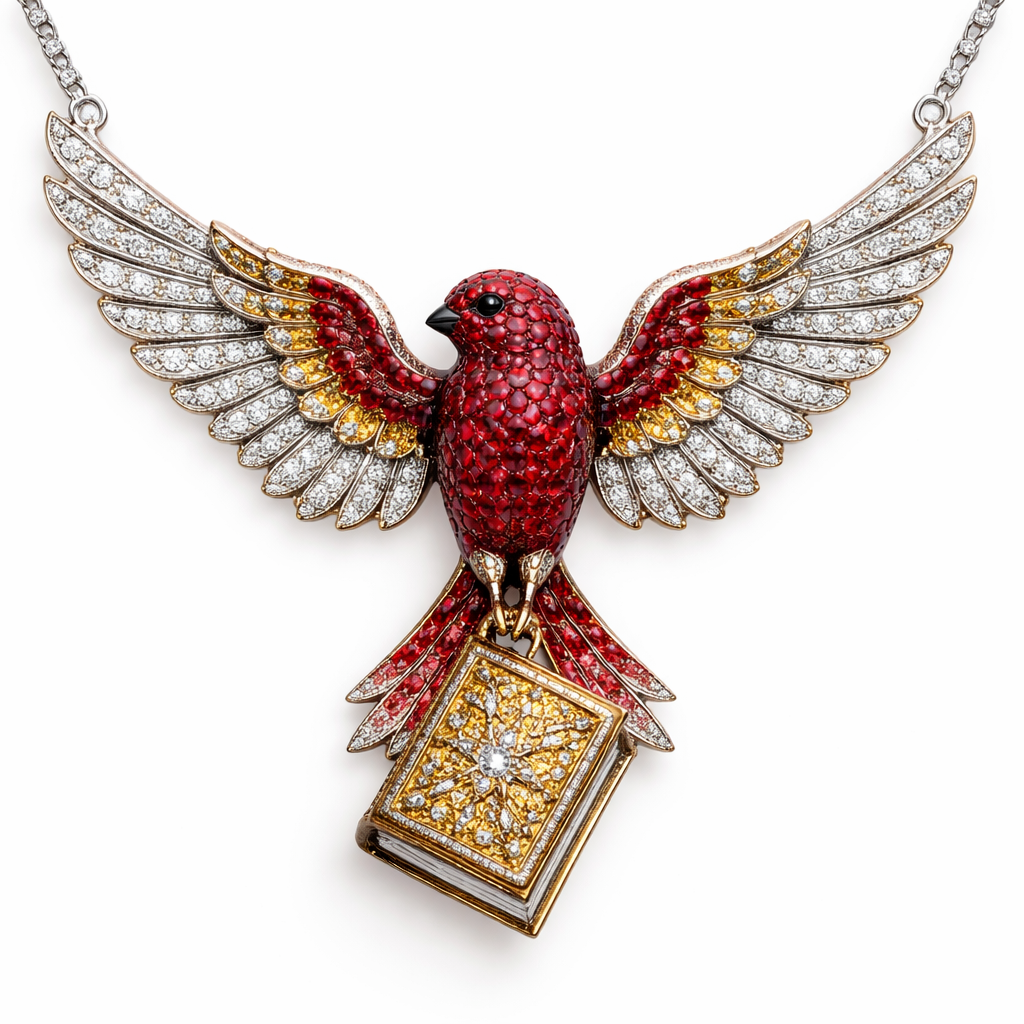 A red sparrow with the wings attached to on each side where the chain connects so the wings are open on the sparrow, and the sparrows made from rubies and diamonds, and the wings are made from silver and gold diamonds and at the bottom it’s holding a book the book is studied withstones of gold and diamonds, and that’s it for now so yeah that, classic style