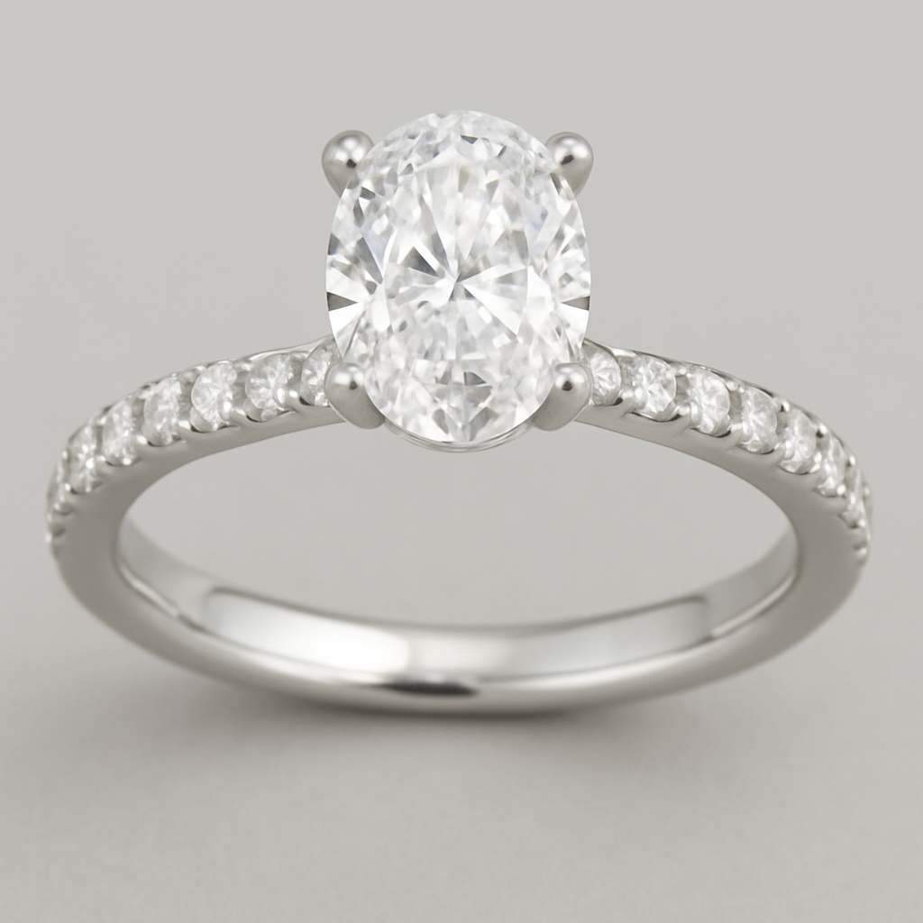 Platinum Solitaire ring with a 1.50ct Oval diamond soldered onto a curved wedding band that must have 25 x 1mm small round diamonds in claw setting