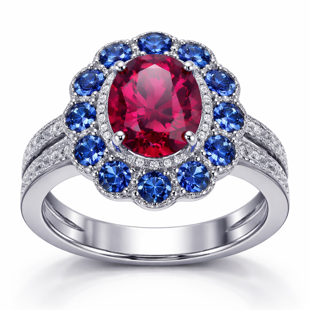 I want a stainless steel ring with a ruby in the middle and blue sapphires all around