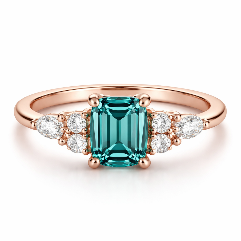 Rose gold ring with a teal moissanite .75 ct emerald cut center stone. To the side of the center stone on each side are two circular diamonds and on the end is one marquise diamond