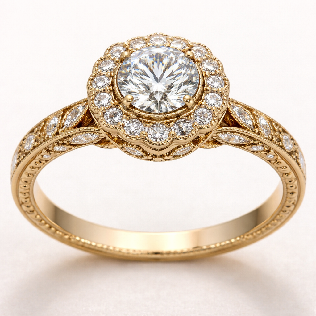 Gold vintage engagement ring with a halo and hidden halo connected by a basket and a thin leaf eternity band with milgrain on the inside, vintage style