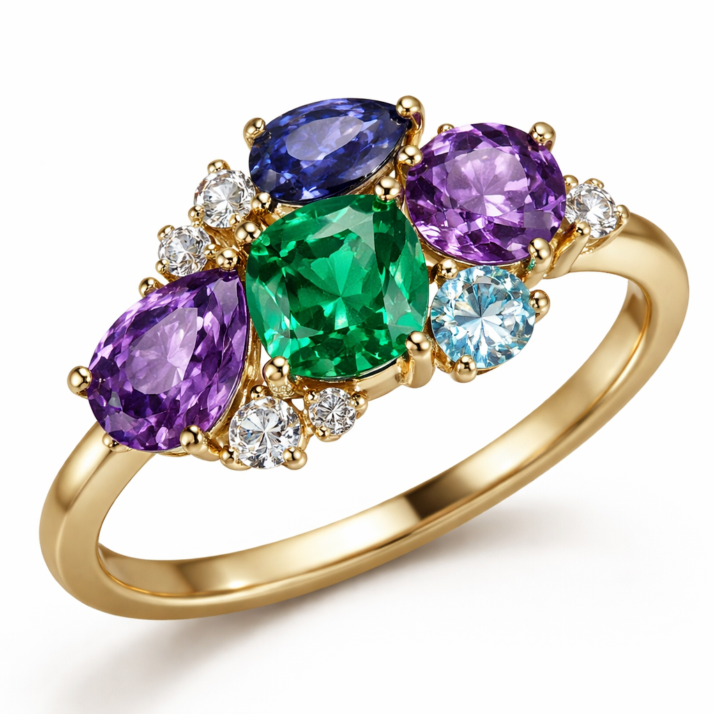 Create a delicate asymmetrical cluster of gem stones including 1 each of emerald, blue sapphire, 2 each amethyst and a blue topaz use different shapes. yellow gold band with gold prongs. sprinkle in some diamonds and focus on the emerald being in the center as one of the larger stones and one of the amethyst also being towards the center as one of the bigger stones and the other three stones are the children’s stones that can be a little bit smaller, royal style
