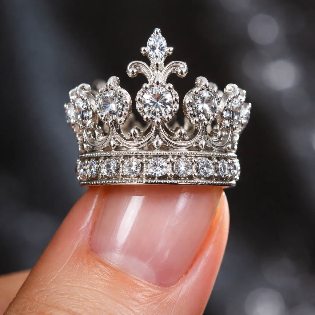 A fingernail sized crown with lots of diamonds on it with silver architecture and intricate designs on someone’s thumb
