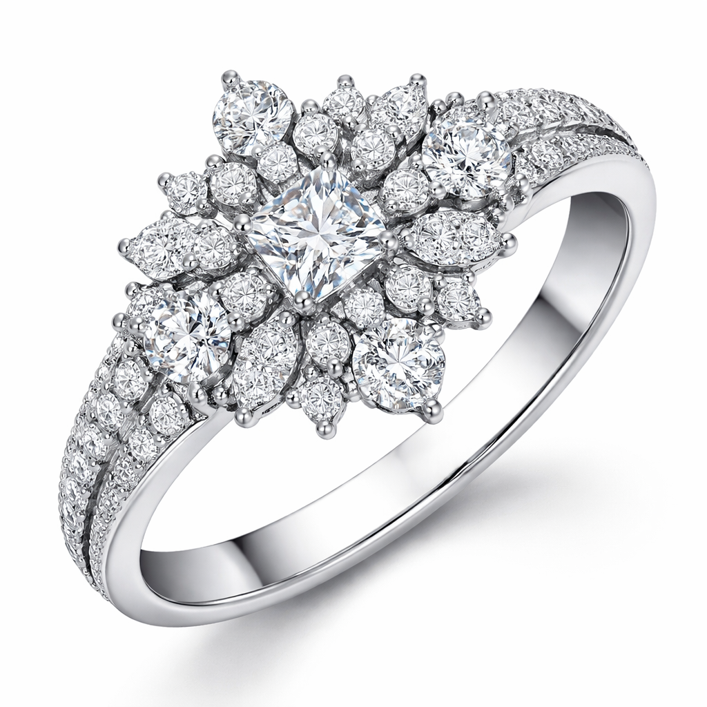 Bague type bandeau en or blanc, avec les diamants disposés façon flocon. Diamants à utiliser : un de taille princesse, de 0,5 cm par côté + 1 brillant de 0,5 cm de diamètre + 1 diamant de 0,4 cm de diamètre + quelques uns de 0,2 de diamètre et plusieurs de 0,1 de diamètre