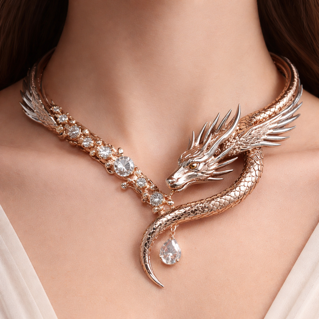 A dragon around the neck in brown and white silvery and a stones around the dragon with good looking , minimalist style