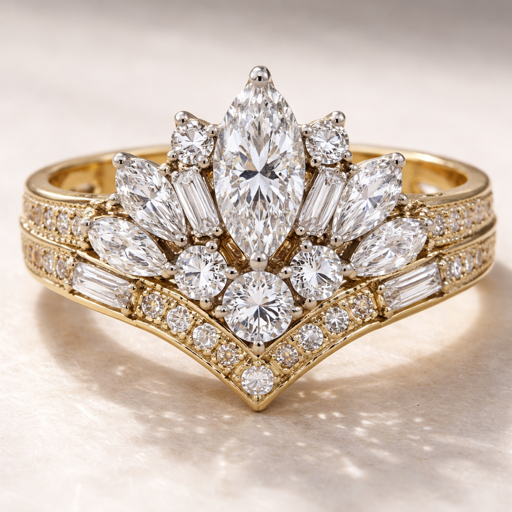 10:22 .分29 Close .6 karat marquise centered, with .25 round directly under it with 6 more smaller marquise diamonds and 2 .20 karat round diamonds mounted on a wide 14k yellow gold band. Make the design in a fan shape and use platinum prongs add some baguette diamonds also this is the exact size of the 6 smaller marquise stones 6 baguette stones in the design, vintage style