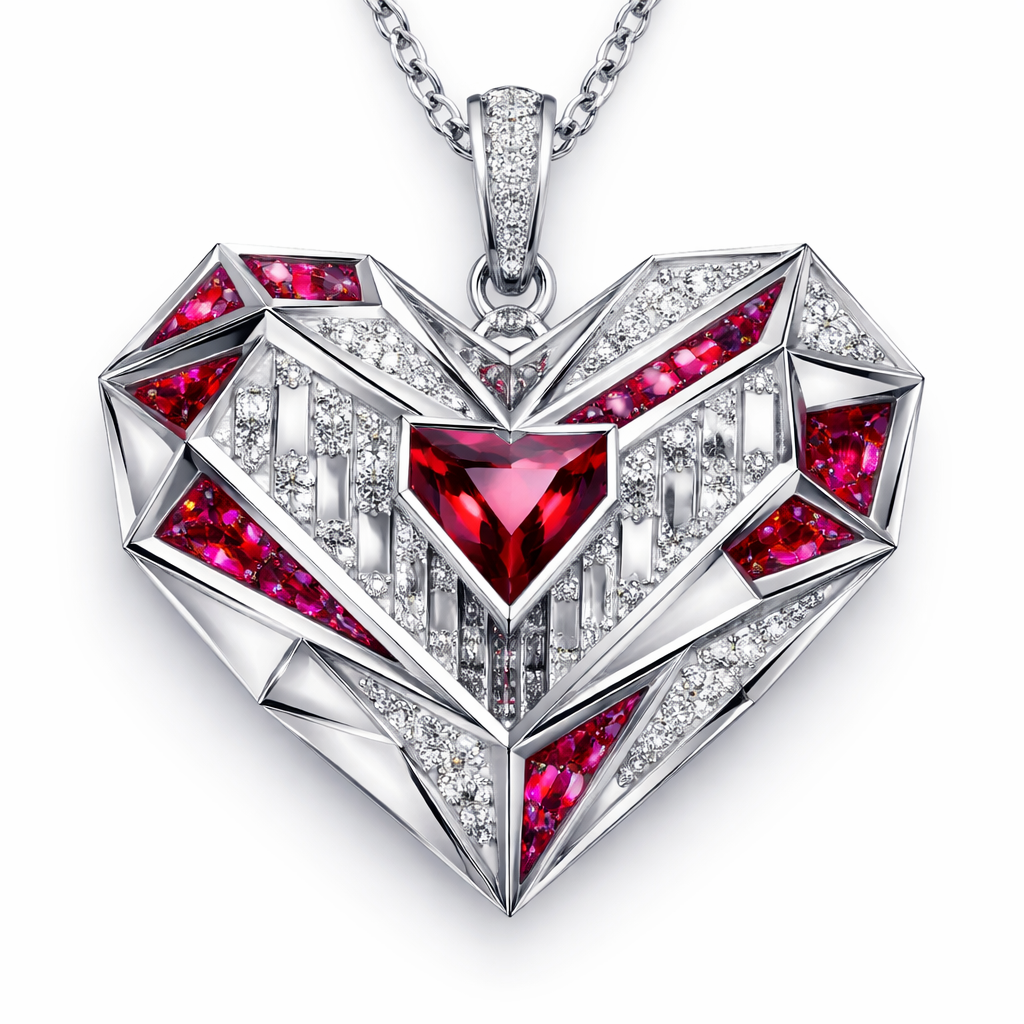 Geomatric heart pendant of architecture and modern shape and edges shapes of bold style of white and ruby of white background