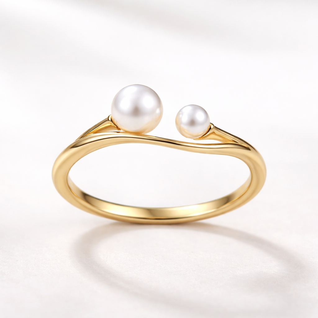 💍 Overall Design • The ring must be open at the top (adjustable style) • The bottom of the ring must remain fully closed • The band thickness should be approximately 2 mm ⸻ ✨ Top Structure (Very Important) • The ring must have a slight crossed / wrap effect at the top • The two sides of the band should look like they are gently overlapping or crossing each other, not simply facing each other 👉 This is very important: I do NOT want a simple open ring. I want a crossed, wrap-style design. ⸻ 💎 Element Positioning • There are two elements only (pearls or stones depending on the version) • These elements must be placed at the top of the ring, on each side of the crossed band • The elements should feel: • closer together than the current version • but still NOT touching • There must be a small visible gap (approximately 1 to 2 mm) between them ⸻ 🌿 Shape & Flow • The band must feel: • curved and fluid • soft and organic • not straight or rigid • The design should look like the ring is: 👉 gently wrapping around the finger ⸻ ⚖️ Balance • The design should feel: • slightly asymmetrical • natural • not perfectly centered or mechanical • The top should feel more compact than the current version, but still light and airy ⸻ 🔧 Connection Details • The connection between the band and the pearls/stones must be: • thin • delicate • not bulky • The elements should appear slightly lifted, not flat on the band ⸻ 🤍 Pearl Version • 1 pearl: 6 mm • 1 pearl: 4 mm • Mounted on a metal pin + internal adhesive (no visible glue)