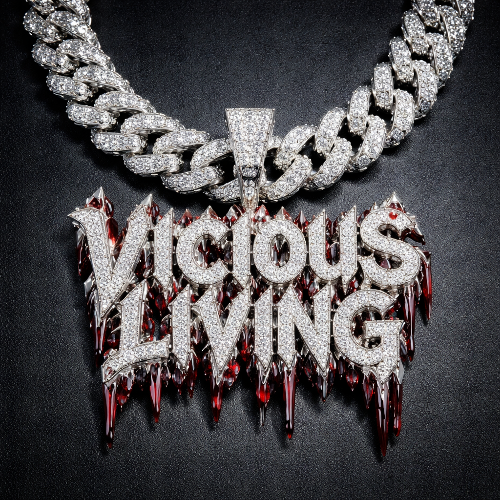Blood Font written VICIOUS LIVING The Chain (Cuban Link): It is a custom, heavy-duty Cuban link chain made of white gold. The links are exceptionally large and entirely "iced out" (covered) with VVS diamonds. The Pendant: The pendant features a "one-of-a-kind" design with a mix of diamonds . It also features unique pyramid-cut jewels and an elevated structure. Diamond Type: The piece is flooded with high-quality, brilliant-cut diamonds. white gold, all adorned with baguette diamonds. The style generally consists of thick, wide, 14k-18k white or rose gold Cuban links completely flooded with VVS natural diamonds. , vintage style