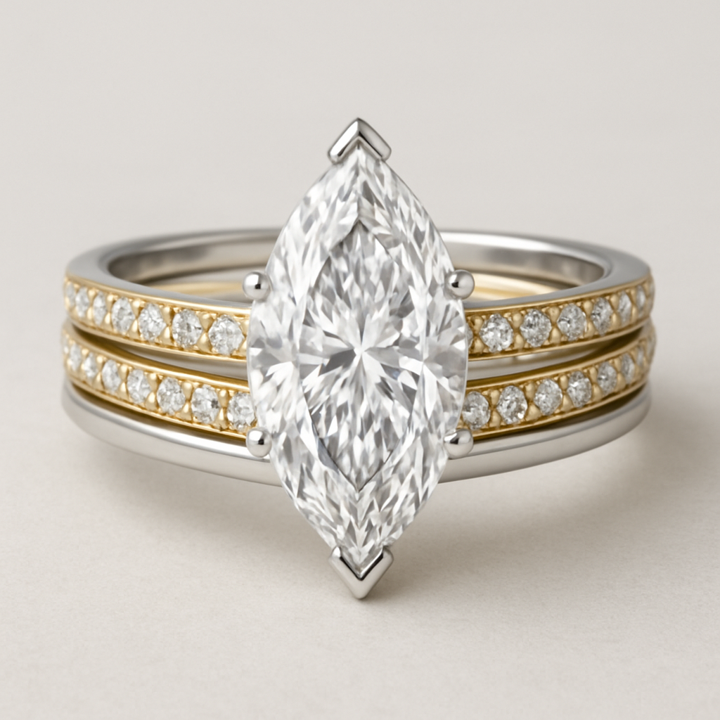 Marquise 2.5 carat, three separate bands, main band silver, second and third bands gold, accent diamonds in band