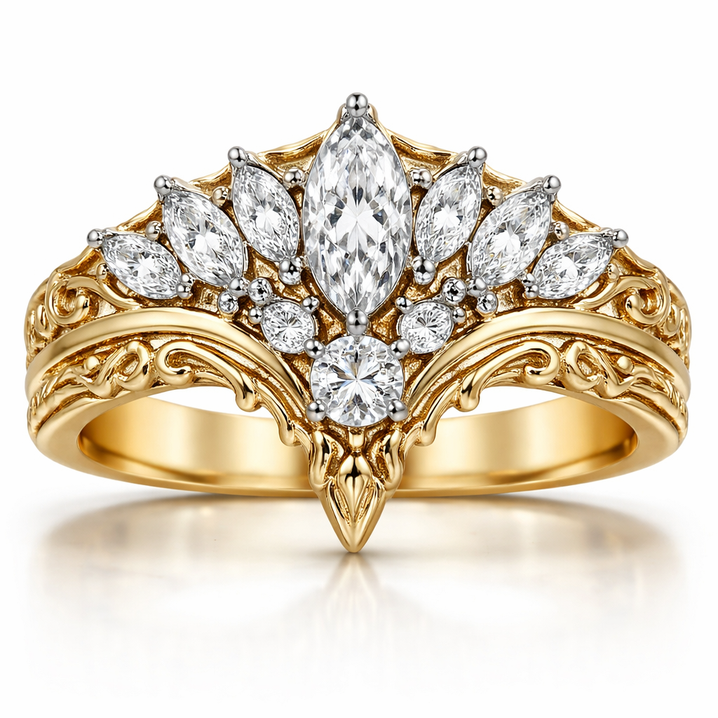 .6 karat marquise centered, with .25 round directly under it with 6 more smaller marquise diamonds and 2 .15 round diamonds mounted on a wide 14k yellow gold band. Make the design in a fan shape and use platinum prongs, gothic style