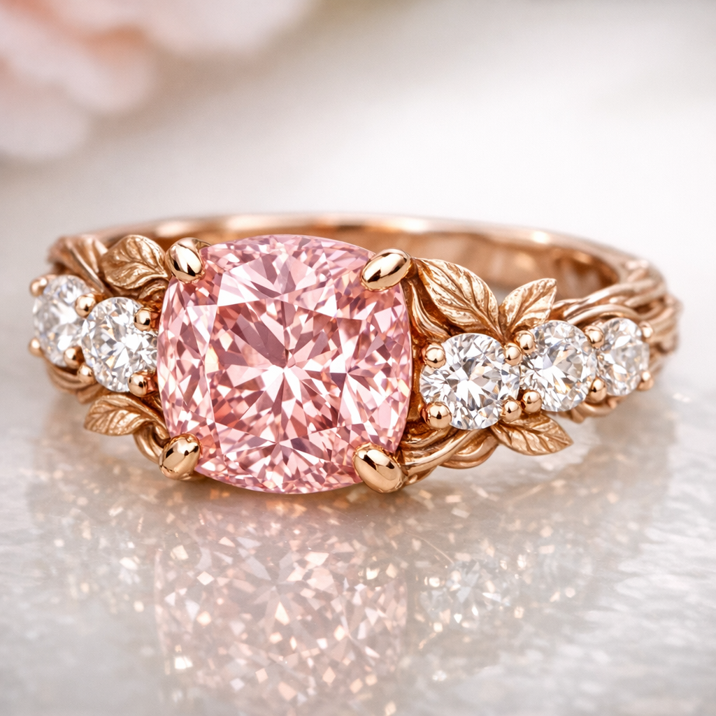 Nature Inspired jewelry: Enhance: An engagement ring with a 5-carat pink diamond, six 0.6-carat diamonds, and delicate rose gold leaves wrapping around the stones, symbolizing everlasting love and growth.