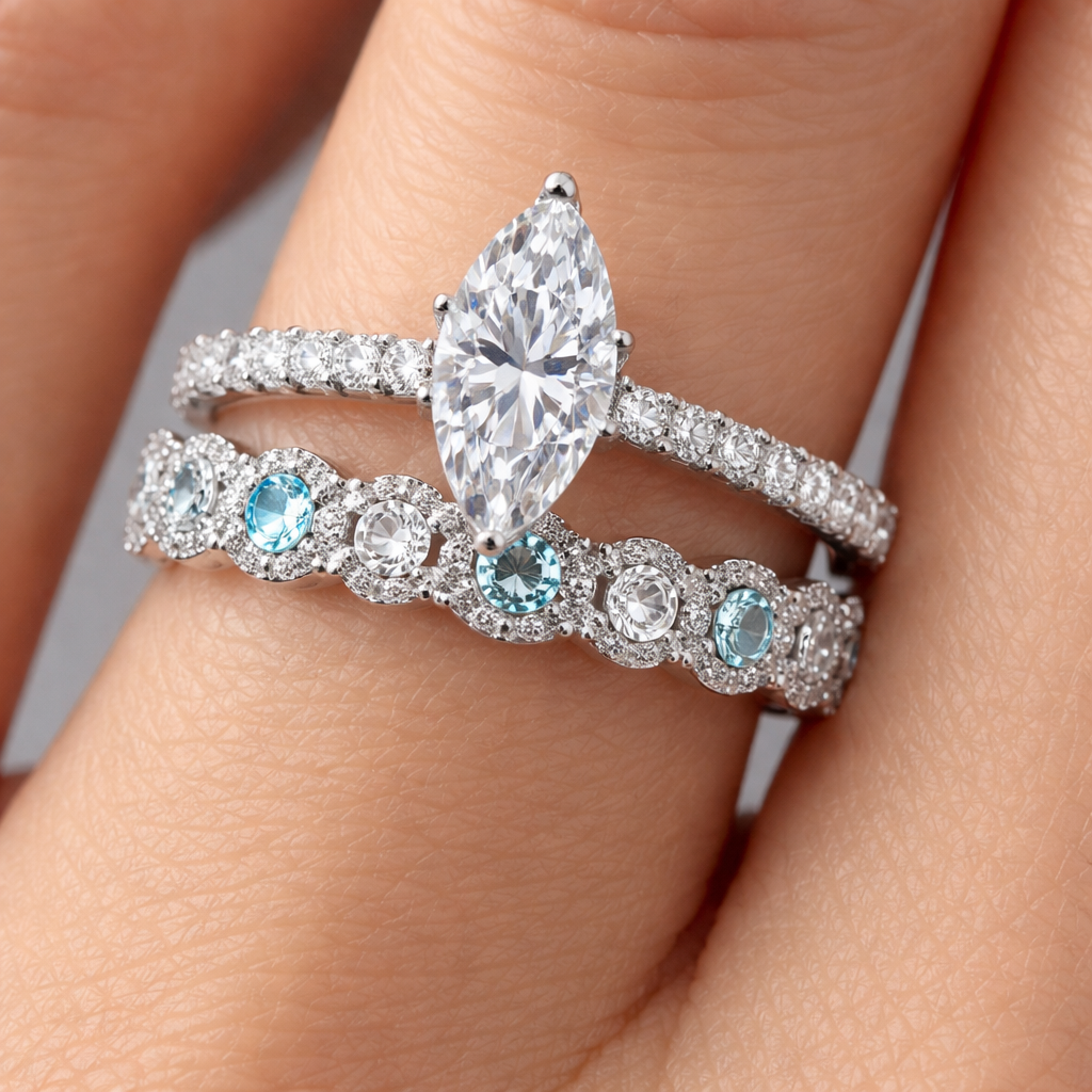 Marquee solitaire with diamond band and diamond and aquamarine wedding band