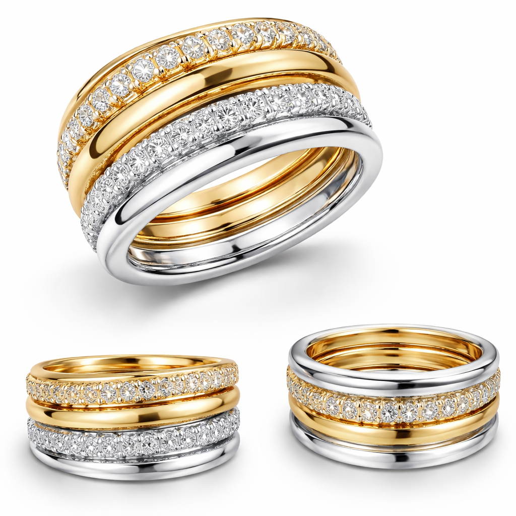 Create a luxury pinky finger ring design that appears to be four stacked rings but is actually one single connected ring piece. The design should look elegant, modern, and high-end. It must combine both gold and silver tones harmoniously. The four visible bands should be: 1. A gold band with sparkling white zircon stones pavé set across the front 2. A plain polished gold band with a sleek minimalist finish 3. A silver band with white zircon stones pavé set across the front 4. A plain polished silver band with a clean modern finish All four bands should sit closely together as if stacked naturally, but engineered as one ring for comfort and stability. Designed specifically for the pinky finger, feminine proportions, luxurious craftsmanship, refined detailing, premium jewelry aesthetic. Style direction: contemporary luxury, Cartier / Bvlgari inspired, sophisticated, wearable statement piece. Show in photorealistic jewelry render on clean white background, multiple angles, high detail, realistic metal shine, gemstone sparkle, premium product presentation., modern style
