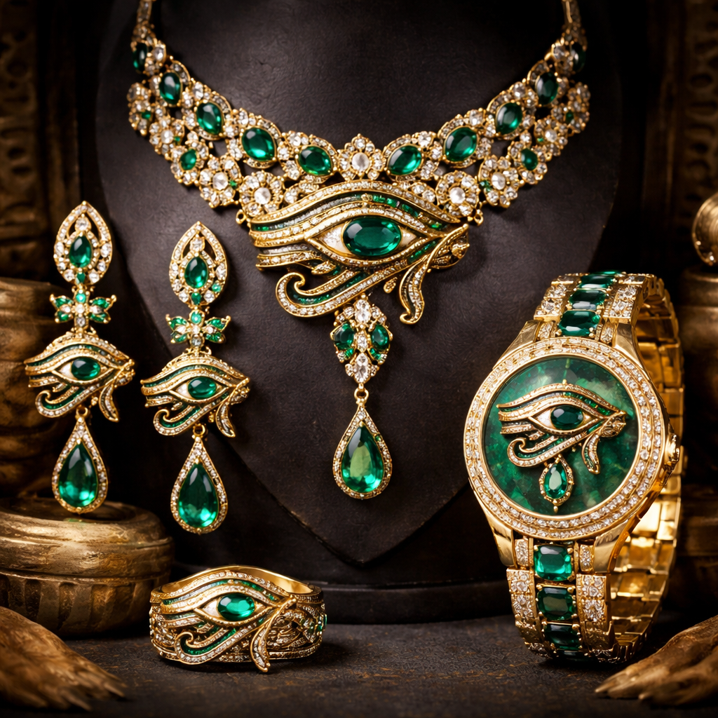 emirate eye of urus safari Green Gold dark Egypt simple set earing watches neckles full set miniature , diamond style