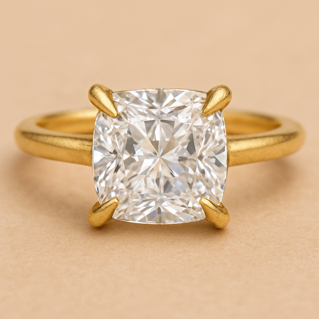 Elongated cushion diamond in yellow gold with Talon prongs at north south east and west Talon prongs, mediterranean style