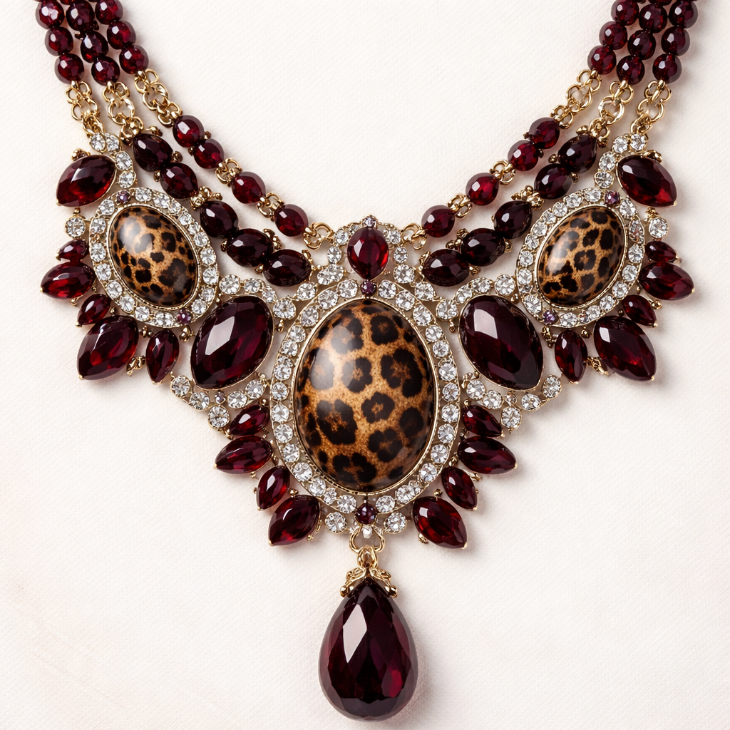 Gem stone necklace on a gold chain. Gem stones are connected by the chain and are different shapes and colors are light ...
