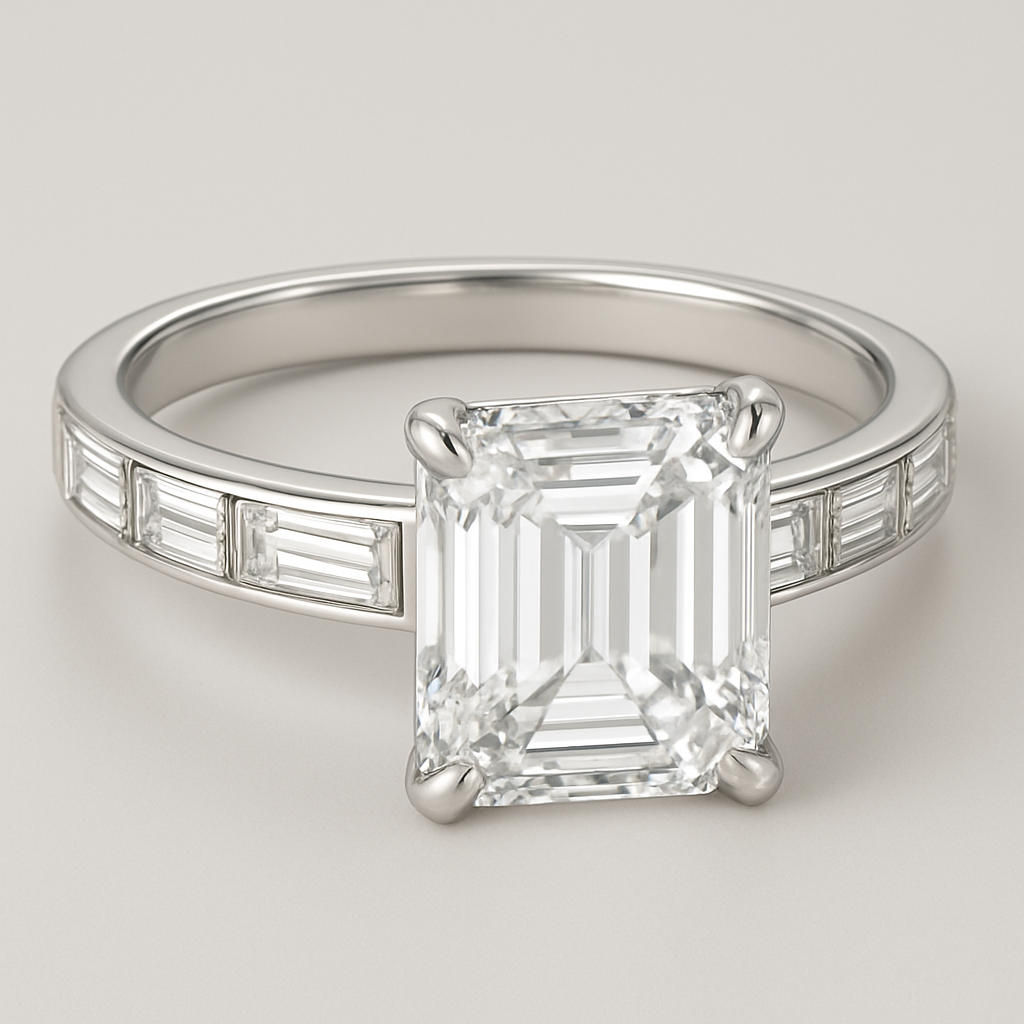 White gold prong set 5ct emerald cut diamond ring with bezel set east west baguettes around the band