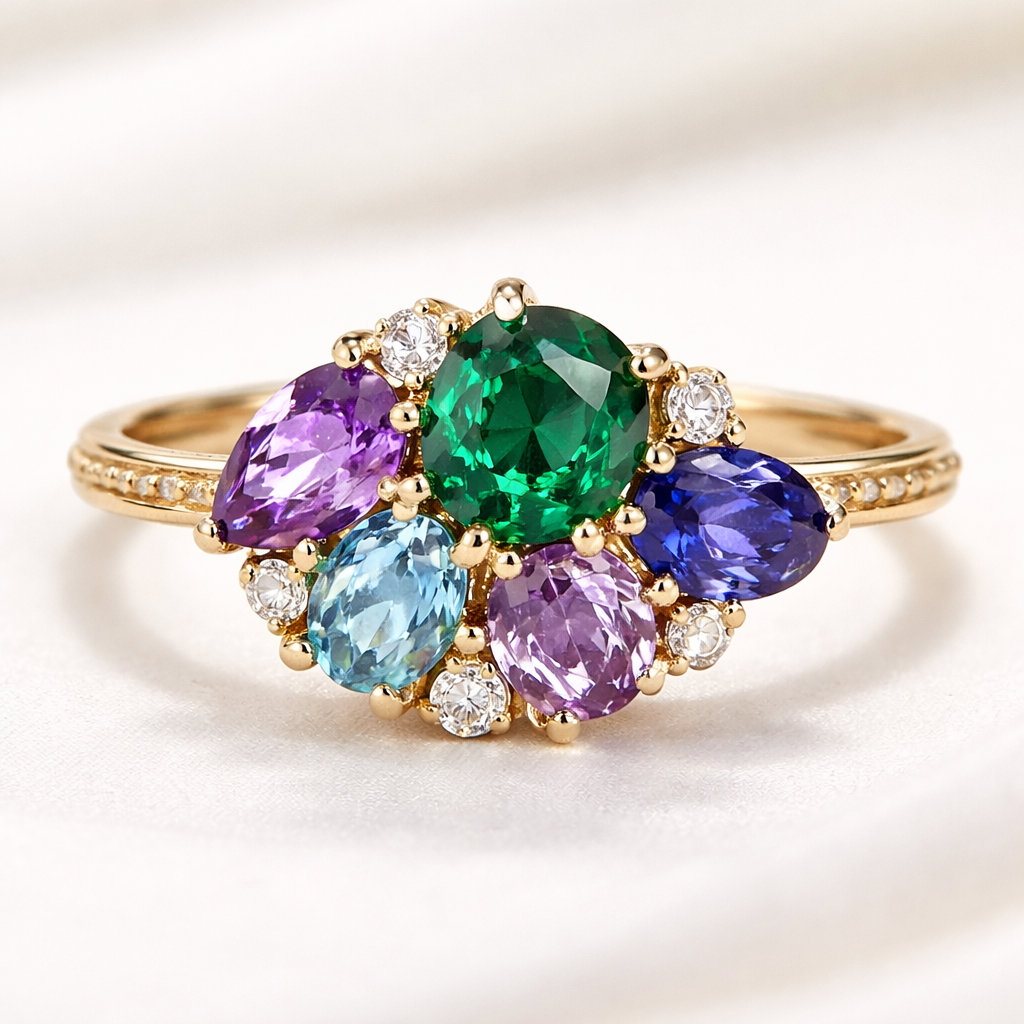Create a delicate asymmetrical cluster of gem stones including 1 each of emerald, blue sapphire, two amethyst and a blue topaz use different shapes. yellow gold band with gold prongs. sprinkle in some diamonds and focus on the emerald being in the center as one of the larger stones and one of the amethyst also being towards the center as one of the bigger stones and the other three stones are the children’s stones that can be a little bit smaller, vintage style