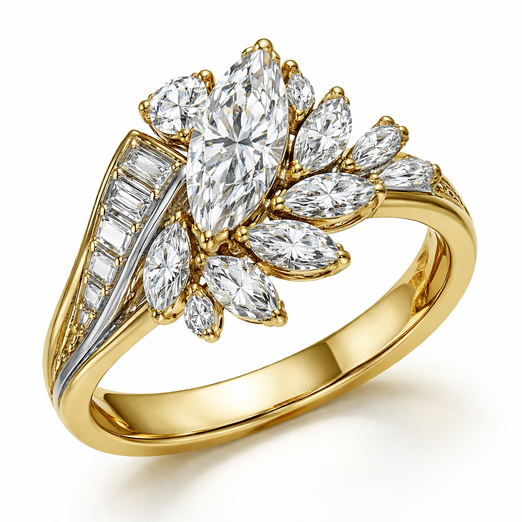 Asymmetrical diamond ring design with 1 .6 marquise , 1 .25 round , 6 smaller marquise, 2 .15 round and 4 .1 baguettes on a yellow gold band set in platinum , retro style