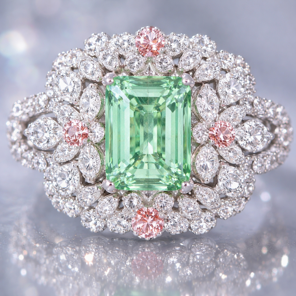 A ring with a rectangle shaped light green gem with tons of sparkles. Lots of smaller flower shaped gems surround it with more gems surrounding the flower gems, gemstone style