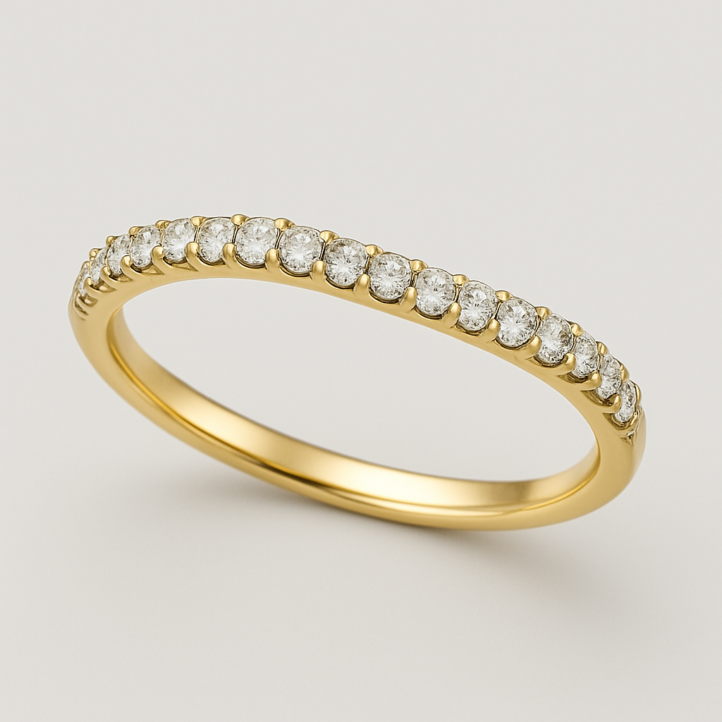 Prong jewelry: Curved gold wedding band, 25 x 1mm round diamonds, prong setting.