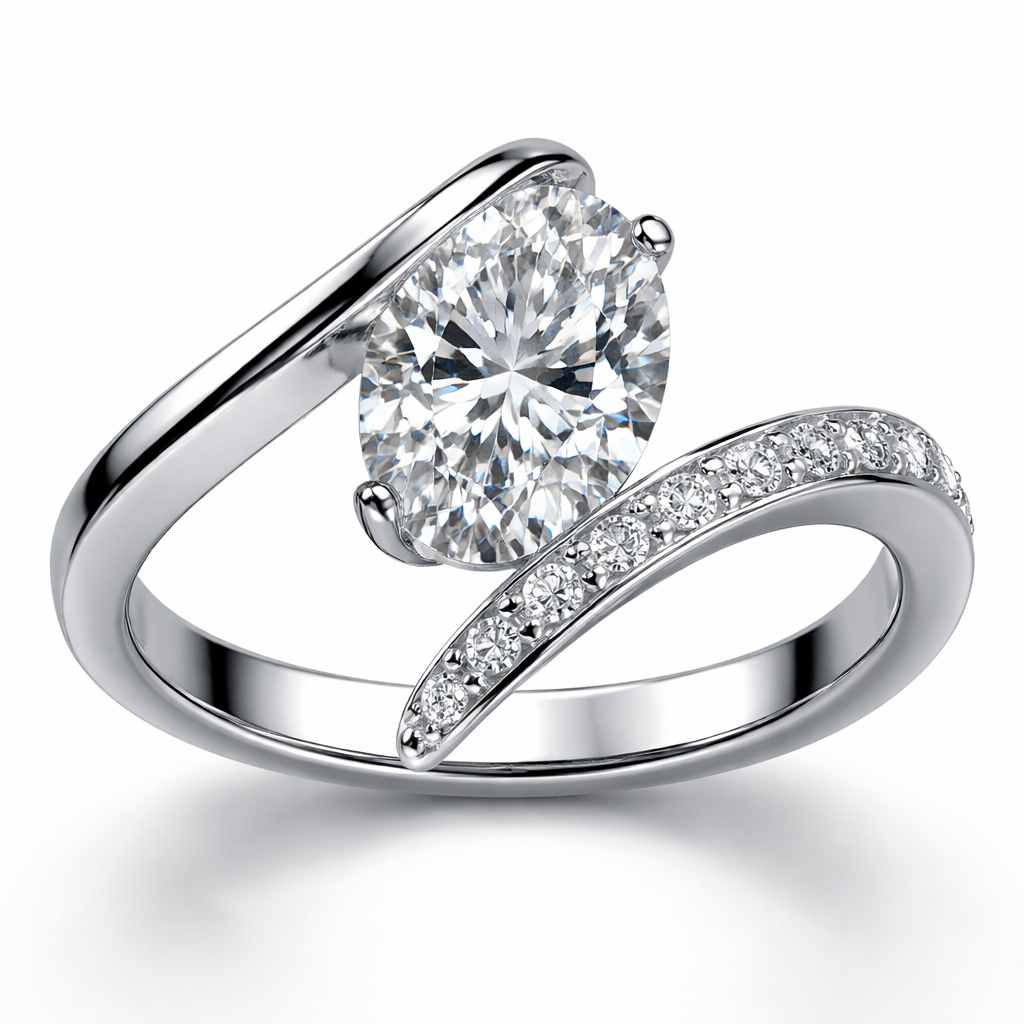 A women's ring made of white gold with diamond stones suitable for engagement. center stone oval 1.00, side stone from e...