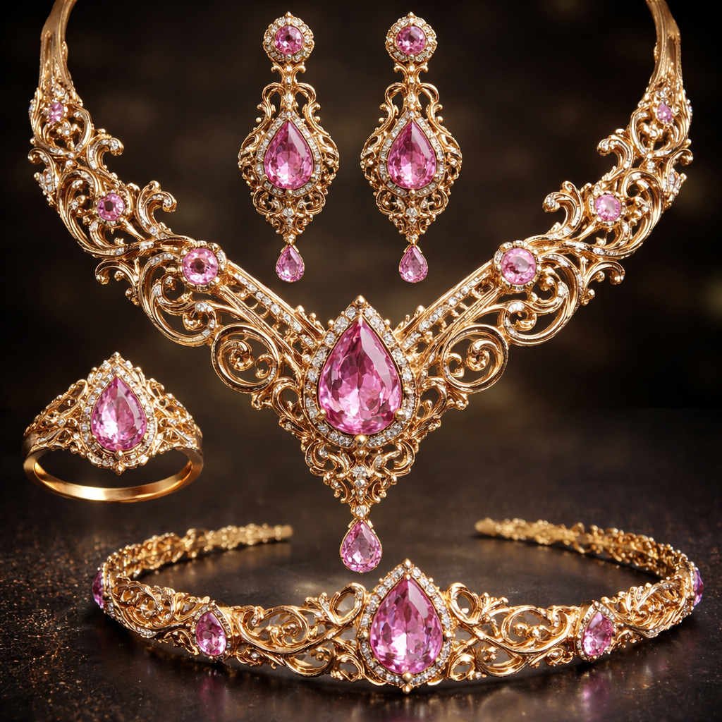 Gold 14k pink sapphire jewelry set, fantasy style
