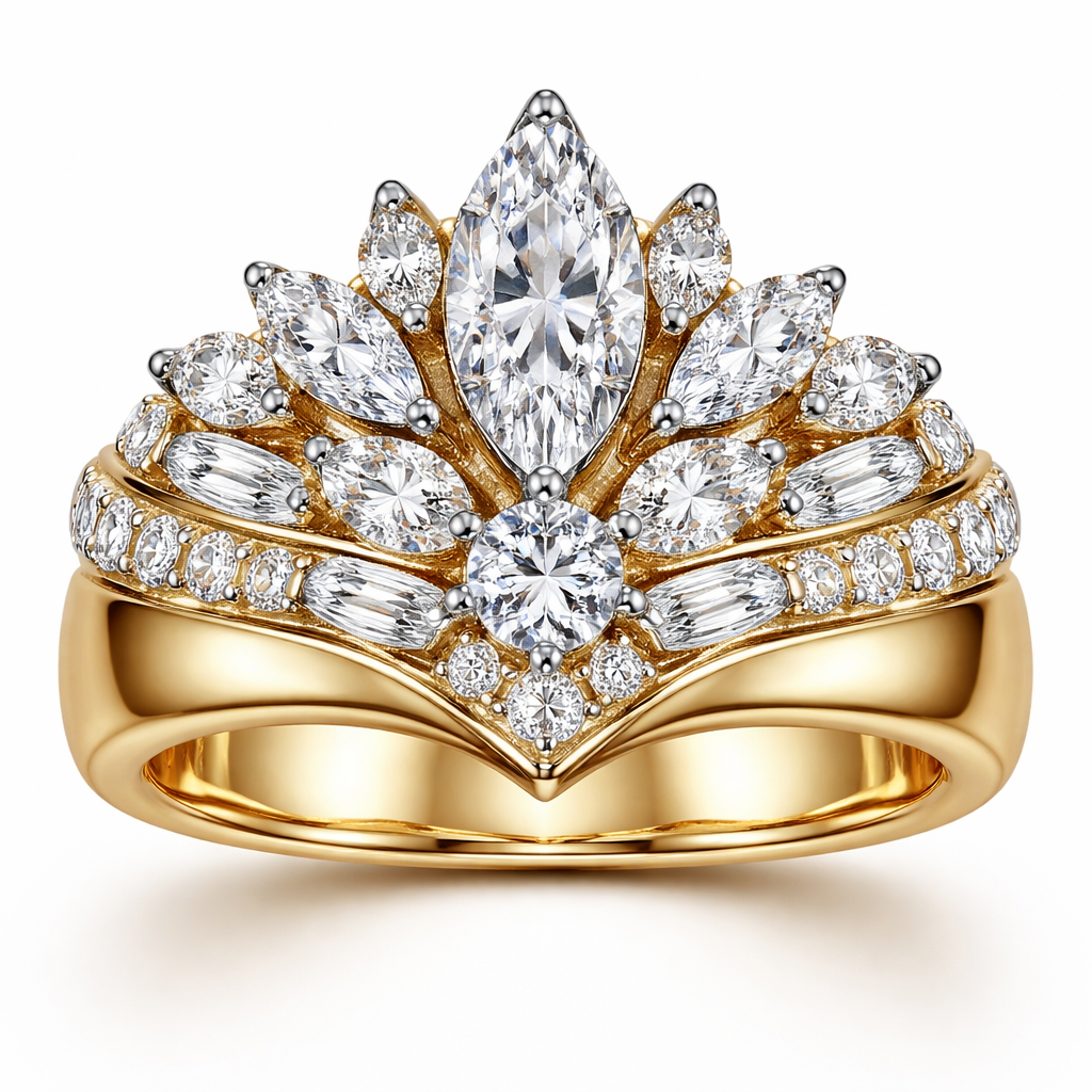 10:22 .分29 Close .6 karat marquise centered, with .25 round directly under it with 6 more smaller marquise diamonds and 2.15 round diamonds mounted on a wide 14k yellow gold band. Make the design in a fan shape and use platinum prongs add some baguette diamonds also this is the exact size of the 6 smaller marquise stones and the baguette stones Center round cut Diamond measures 4mm +- 0.25ct 2 x+-5mm x 2.5mm marquise diamonds +-0.13ct each 1 x +-4.5mm x 2.5mm marquise diamond +- 0.11ct 1 x +-3.5mm x 2mm +- 0.07ct 2 x +- 4mm x 2mm +- 0.10ct each 8 x +- 2mm x 1.5mm +- 0.02ct each use 6 baguette stones in the design, vintage style