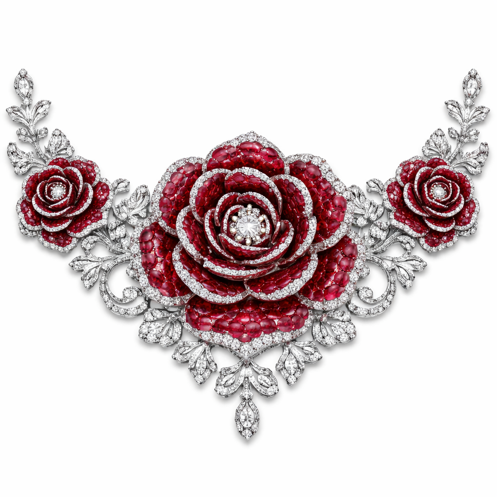 A rose with red rubies diamonds a mother set of small roses on each side diamonds in between