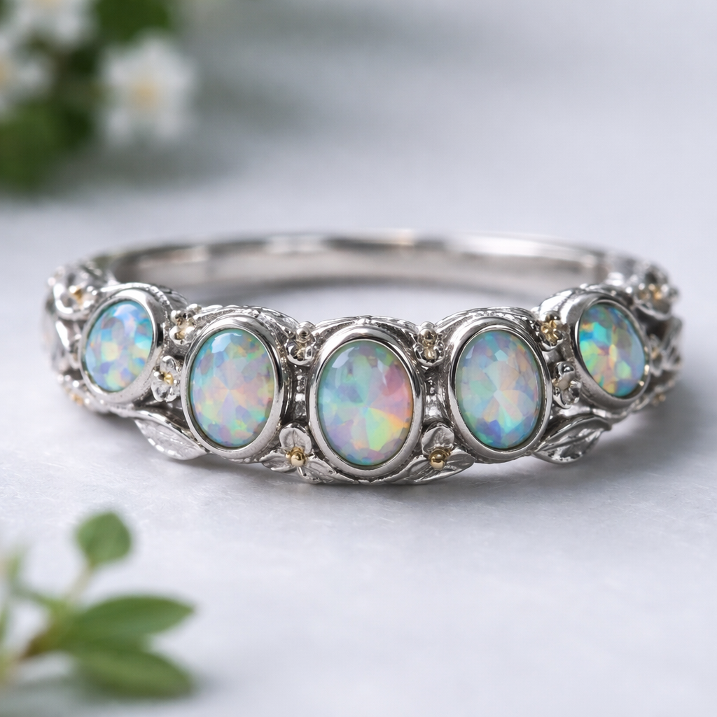 Five small oval opals bezel set on silver ring, nature_inspired style