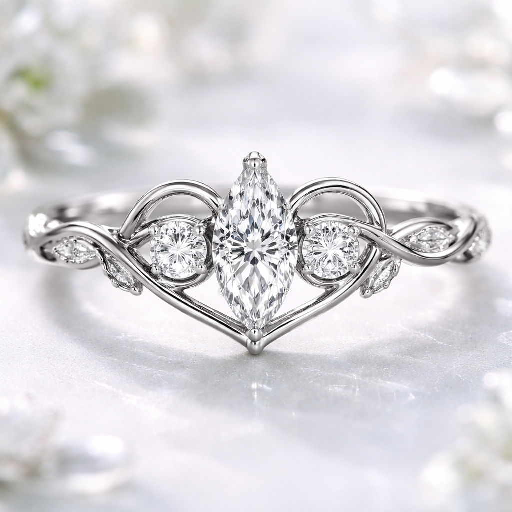 Marquise with a thin twist leaf vine heart design three stone engagement ring, romantic style