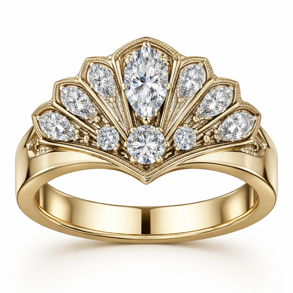 .6 karat marquise centered, with .25 round directly under it with 6 more smaller marquise diamonds and 2 .15 round diamonds mounted on a wide 14k yellow gold band. Make the design in a fan shape and use platinum prongs, art_deco style
