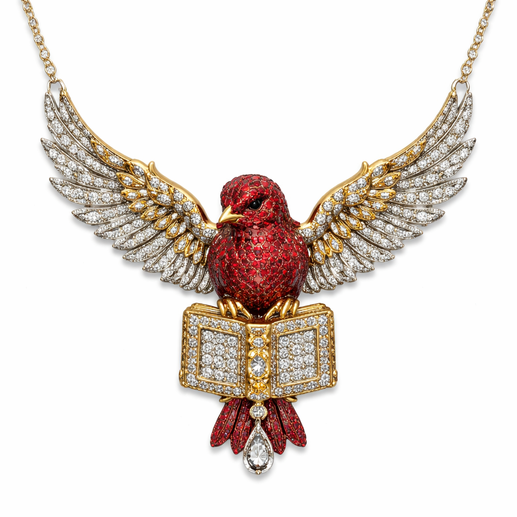 A red sparrow with the wings attached to on each side where the chain connects so the wings are open on the sparrow, and the sparrows made from rubies and diamonds, and the wings are made from silver and gold diamonds and at the bottom it’s holding a book the book is studied withstones of gold and diamonds, and that’s it for now so yeah that, vintage style