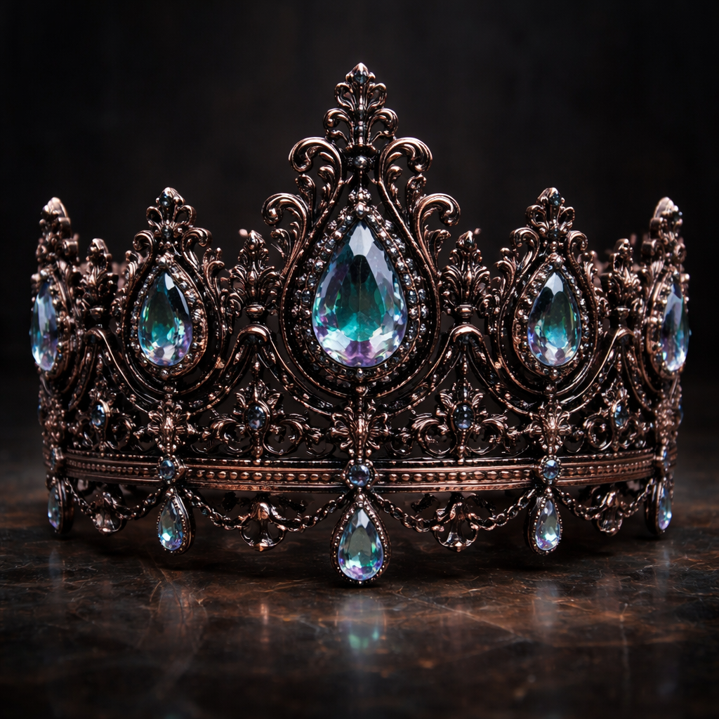 A dark rose gold crown with lots of Alexanderite gems and black diamonds surrounding them , victorian style