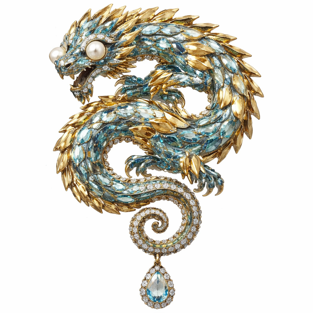 An aqua vvs dragon with gold bars as the scales that 3d popping out. Add topaz blue along the outline of each claws add fresh water pearls as the eyes add a. Spiral retractable tail the is a charm , art_deco style