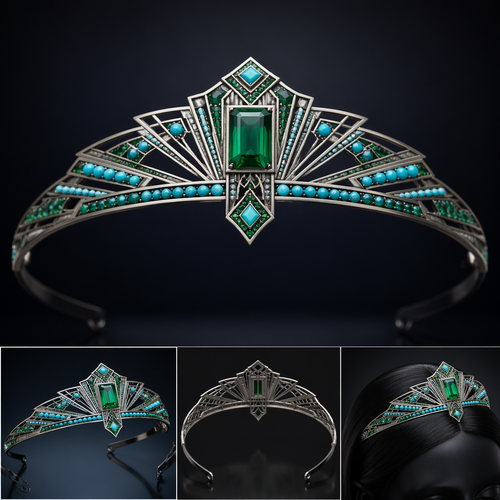 A art deco women's tiara made of titanium with emerald and turquoise stones suitable for party