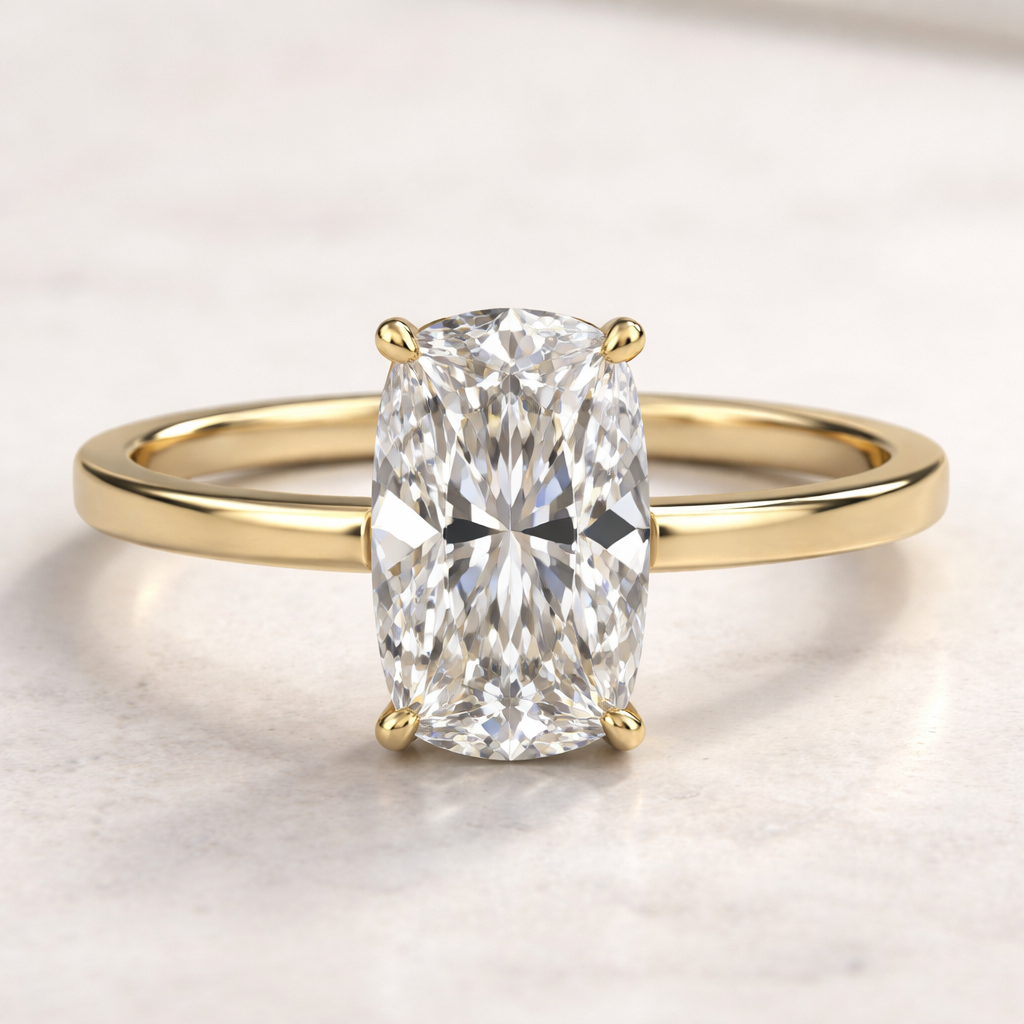 3.5 carat elongated cushion cut diamond with a 1.3 ratio on a 2.7mm flat gold band
