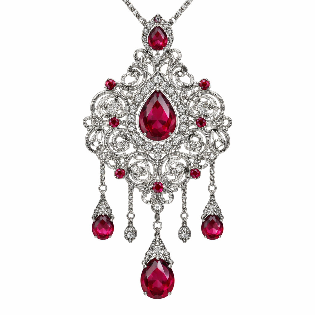 A bohemian pendant made of platinum with ruby stones suitable for wedding, bohemian style
