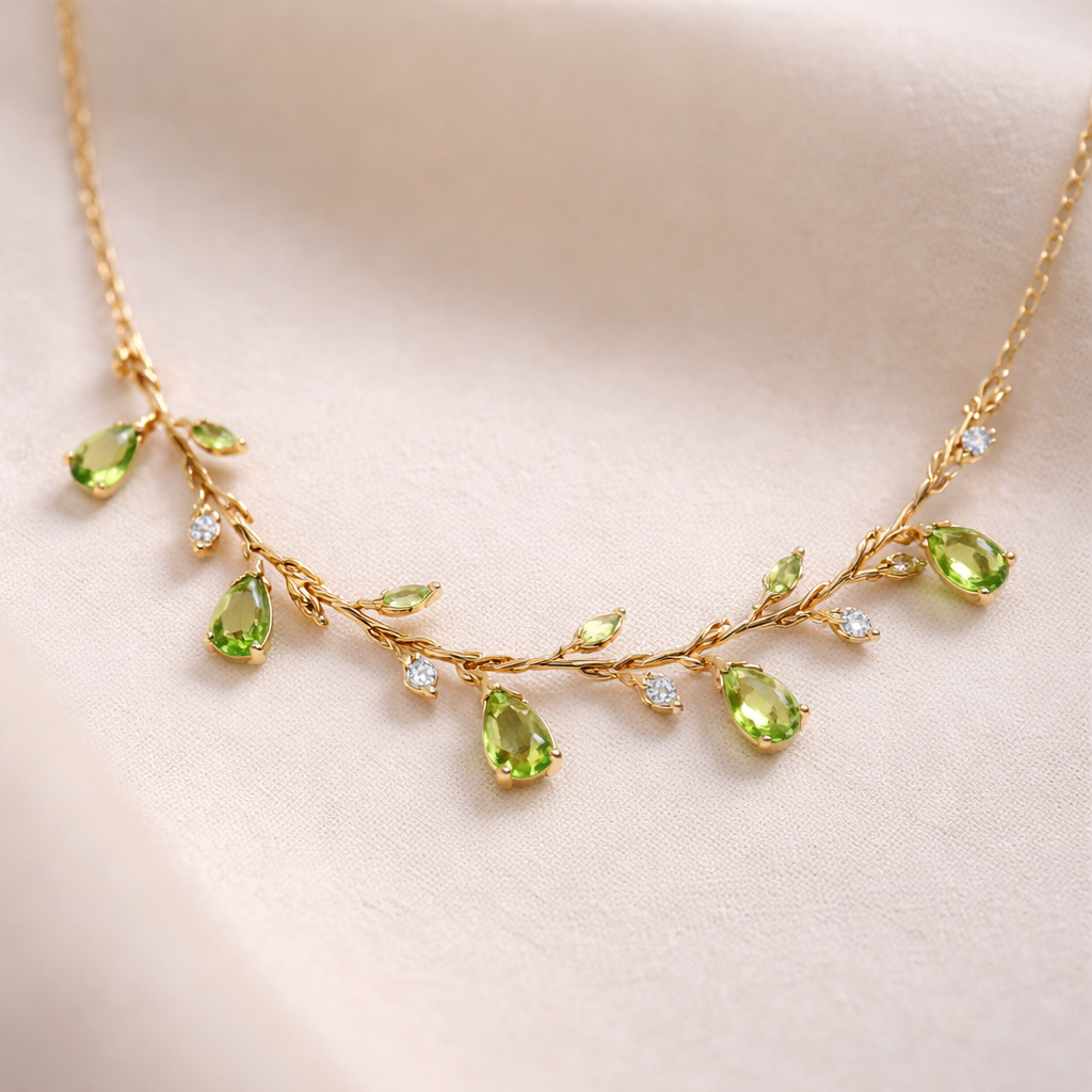 Everyday piece. Thin Gold chain with thin wire wrapped around it like an olive branch and small pear cut bright peridot and diamond stones placed throughout the chain