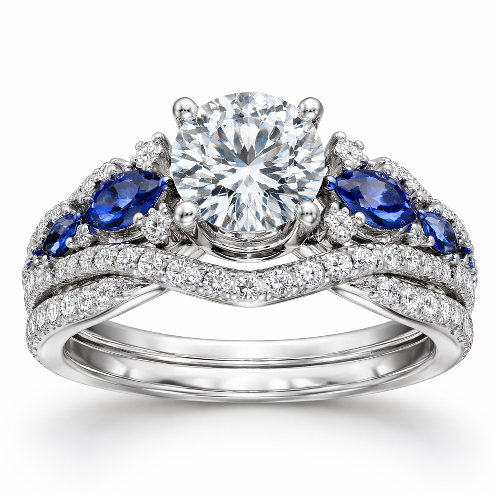 Solitare round middle stone with marquise saphire side stones with raised bride on diamond twist band with side bands
