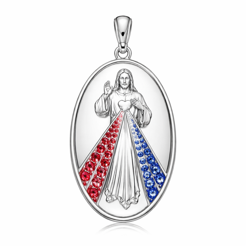 Divine mercy Jesus pendant with blue saphires and rubies on the rays