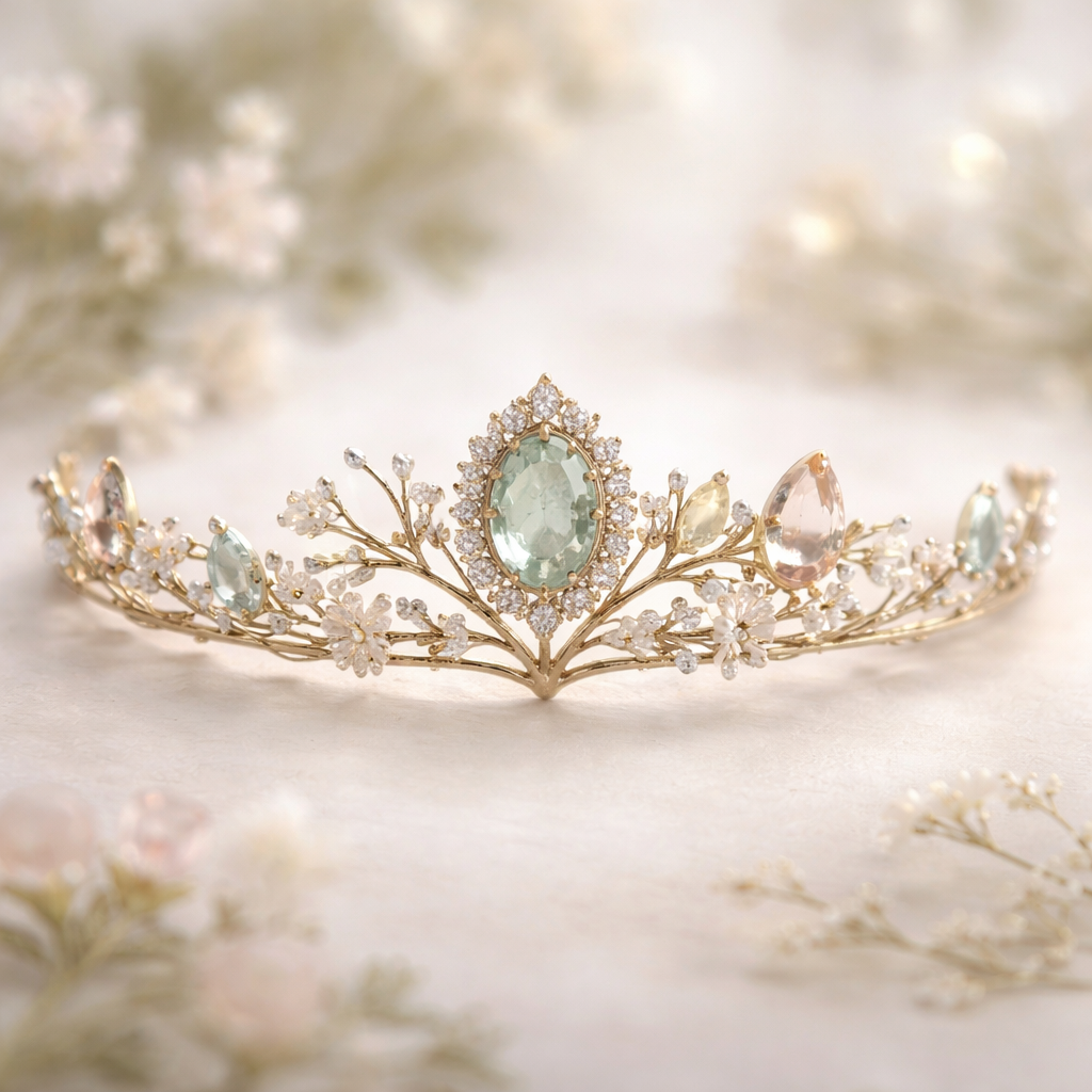 A miminilistic crown with light vintage colours and gems , nature_inspired style